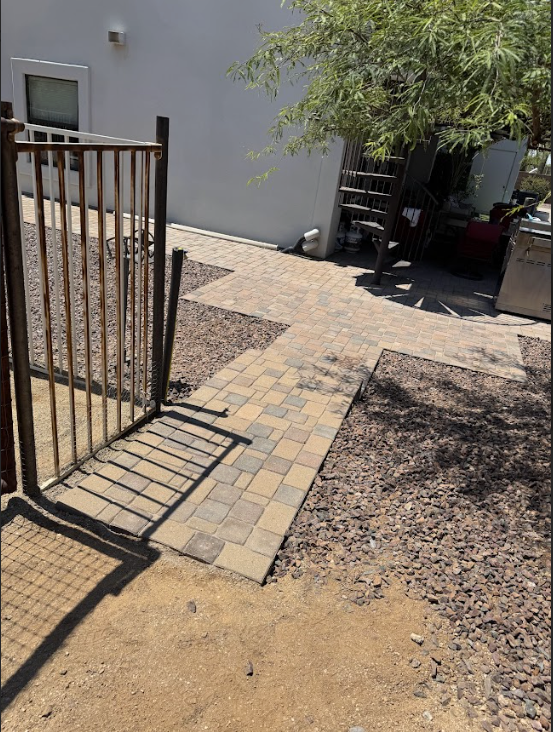 Extend paver patio, reroute water spigot, add 1 paver step, create walkway leading to back gate.